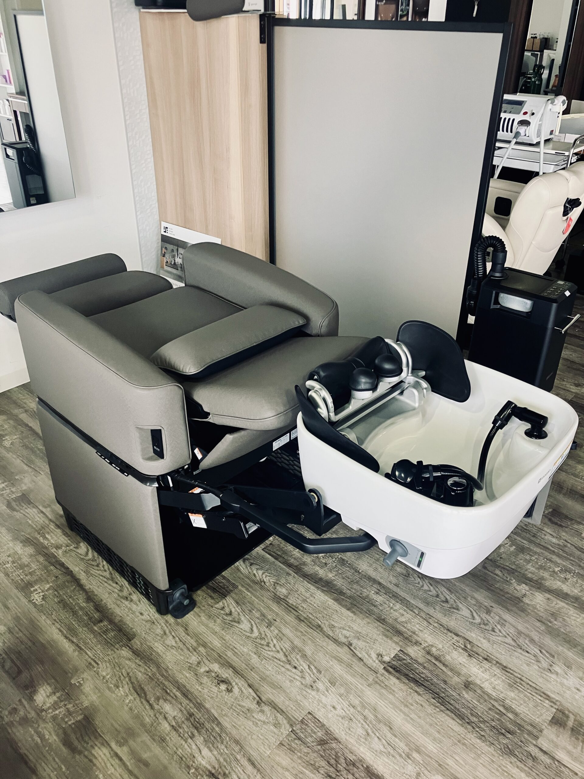 最大の特徴が、カットチェアとシャンプーボウルがワンセットになっていて、なんと椅子の下からシャンプーボウルが出てきます